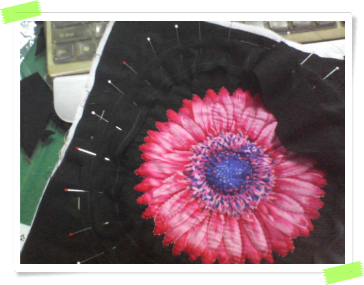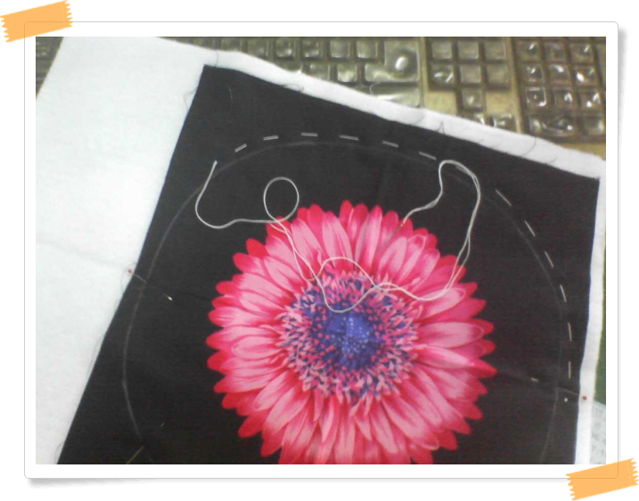# 원단에 프린트 된 꽃 문양이 입체감을 갖도록 퀼팅을 합니다.